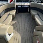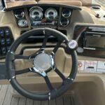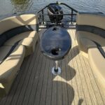 In addition to standard features, additional amenities on this brand new triple pontoon include blue power bimini top with matching playpen cover, full teak weave flooring in brown, extended deck, two High Back helm chairs in tan, Wet Sounds MC2 radio and sound system with four speakers, GPS with mount and antenna, mood lights, black Lillipad REVO ladder with handles, and more!